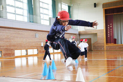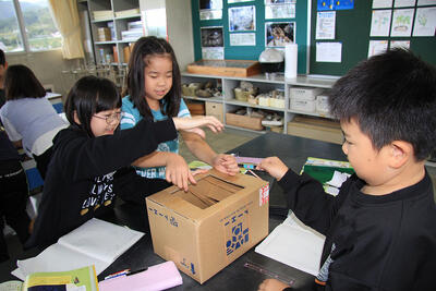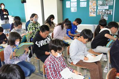 5,6年生が調理している間,4年生がたてわり班の下級生のめんどうを見ます。