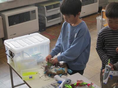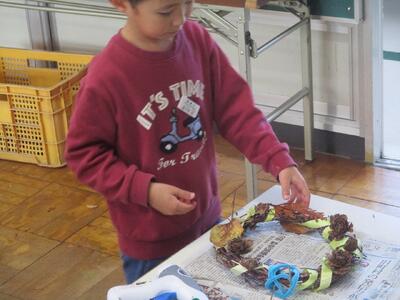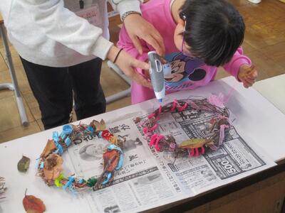 生活科で育ててきたアサガオのツルを使って、リースを作りました。生活科の「秋となかよし」の授業で集めた落ち葉や木の枝、松ぼっくりなどを使って装飾をしました。