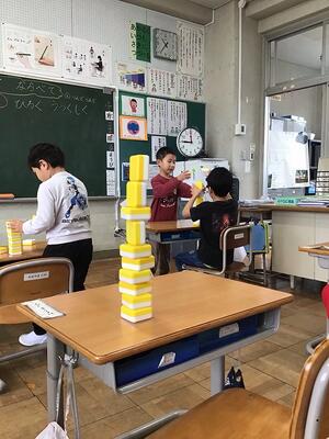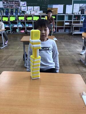 今回は、算数「かたちあそび」の授業で、「はこ」と「つつ」を使い、高く積み上げる活動をしました。「はこは積みやすいから下において!」「つつはさいごにおこう」などと、形の特徴を見つけながら友達と協力して高く積み上げることができました。