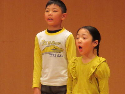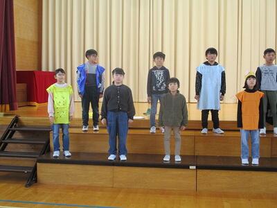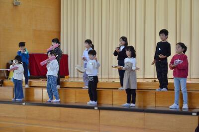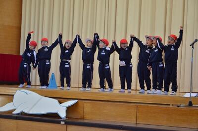 1年生は、国語で学習した「くじらぐも」の劇をしました。「天まで届け、一、二、三。」の掛け声とともに、元気よくジャンプしたり、くじらぐもの上から見た景色を想像して、一人一人が考えたオリジナルのセリフを発表したりしました。くじらぐもの上で歌った「うみ」は、みんなで手をつないで歌っていて、1年生の仲の良さを感じました。