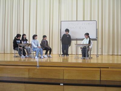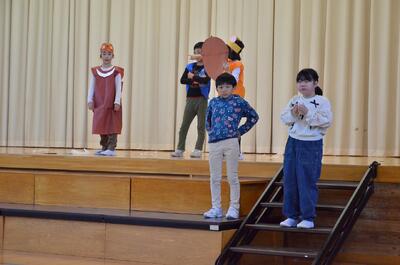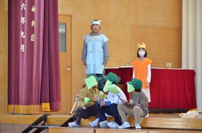 3,4年生は、「関山炭のひみつ」と題して、総合的な学習の時間で取り組んでいる、森林を守る取り組みについて発表しました。人間が捨てたゴミによって動物たちが暮らしづらい環境になってしまっていたり、木の間伐や手入れが行き届いていないことにより、木の成長が阻まれていたり…、森林が抱える問題を劇で伝え、「みんなで森を守るヒーローになろう」というメッセージを届けました。そして、ふるさと高崎地区への思いを「ふるさと」の歌にのせて届けました。森を守ろうという思いが詰まった、素晴らしい発表でした。