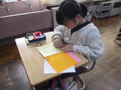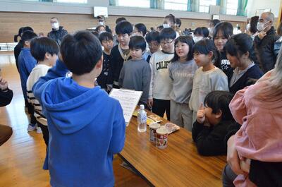 最後の発表は、6年生の 防災「絆」フェス。「防災」をテーマに、総合的な学習の時間で学んできたことを発表しました。防災クイズ、避難所体験コーナー、非常用バックや非常食の紹介コーナーの3つのブースに分かれ、それぞれのブースでの発表を聞きました。ダンボールベッドに寝転がったり、非常食の説明を聞いたり、クイズに答えたりすることを通して、防災や災害時の生活について学ぶことができました。最後には、全校生のみんなで、新聞紙を使って非常用のスリッパを作りました。これまでの学習が凝縮された、学びや発見の多い発表でした。