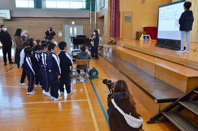 東郷小学校の3~5年生とオンラインでしこたん校友会を行いました。お互いの学習発表会の演目を披露し,お互いのよさについて感想を交流しました。