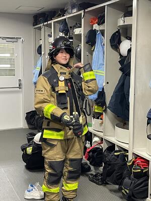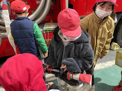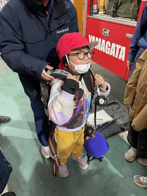 火事の際に着用するタンクを背負わせていただいたり,ホースや訓練で使うバーベルを持たせていただいたりしました。あまりの重さに驚いていました。