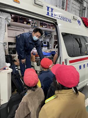 実際に防護服を着る様子を見せていただきました。1分で着用することに驚きを見せていました。日々の訓練が大事だということも教えていただきました。