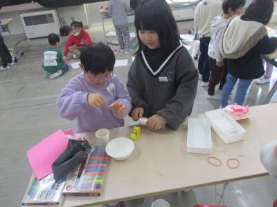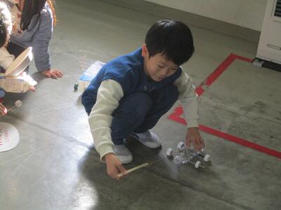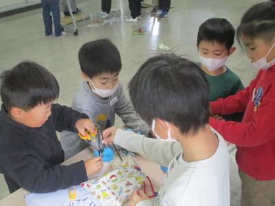おもちゃ作りは、5つのブースに分かれて行いました。パタパタ車、ヨットレース、ビュンビュンカー、グリグリかめさん、ジャンプロケットの5種類のおもちゃを好きな順番で回りました。2年生の説明を聞いたり、一緒に作ったりしながら、次々とおもちゃを作り上げ、遊んで楽しみました。