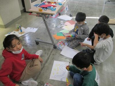 図工の「ならべてならべて」では、ブロックをたくさん使い長い一本の蛇を作りました。これから、図工の「はこでつくったよ」では、「はこ」や「つつ」などの形の特徴を生かして工作をする活動に取り組んでいきます。