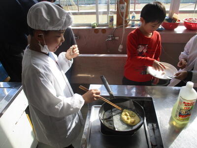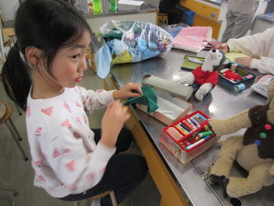 次は,家庭科室で学習している子供たちです。試行錯誤しながら,裁縫でぬいぐるみの服を作ったり,お菓子作りをしたりしています。