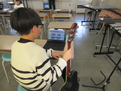 はじめに音楽室で学習している子供たちです。いろいろな楽器の演奏に挑戦しています。