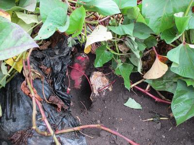 高崎農園に,ヤミに紛れて野生のイノシシが訪れたようです。周辺に,足跡や鼻先で土を掘り返した跡がついていました。また,マルチに穴があいていたり,サツマイモが掘り起こされてかじられたりしてもいました。ジャンボキャベツを食べようとした跡も認められました。