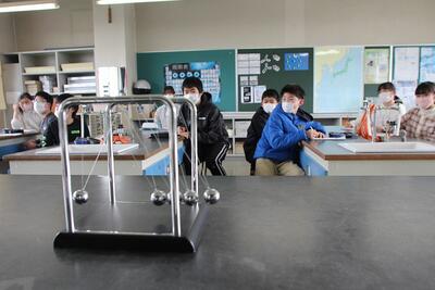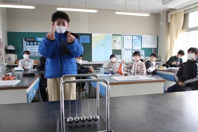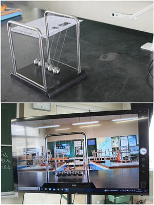 6年生は,新しい「きまり〔法則〕」を見つけ出す実験,科学的な事実から「しくみを考え出す実験」を新たに行いました。最初の実験は,バランスボールを使った「衝突」実験です。衝突させるおもりの数を変えて,他のおもりに衝突させたときのおもりの動き方と,左右から衝突させるおもりの数を変えて,同時に衝突させたときのおもりの動き方を予想を立てたあと実験で確かめました。