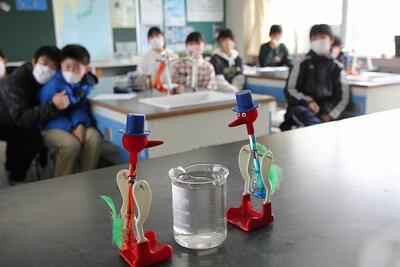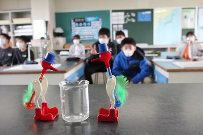 水飲み鳥を初めて見たアインシュタインは,「これは,永久機関ではないのか?」と,最初は驚いたと言います。水を飲み始めるまで,子どもたちはじっと観察を続けました。中の液体がガラス管を通して上昇していくと頭が傾いて水を飲む格好をしたあと,すぐ,頭の中の液体が胴体にもどってきて鳥はまたまっすぐになります。頭の中に液体が上昇していく理由を考えました。水蒸気でふくらんだ袋が冷えるとしぼんでしまうことをヒントに,頭を覆っている水に浸したフェルトから水が気化して,頭を冷やすことで,頭の中の気化していた液体が,液体にもどって,圧す力が弱まったからと考えました。