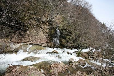 間木野地区を抜けて,黒伏高原スノーパークジャングル・ジャングルに向かいます。途中,残雪がつくる野川の激しい流れが見られます。