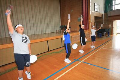 赤組はピロティー,白組は体育館で,初の全校応援練習に取り組みました。