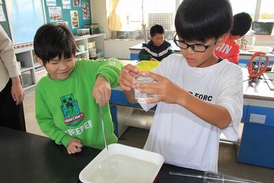 食塩水とミョウバンの水溶液の溶け残りを全部溶かす方法を考えました。 ①溶液を温める,②溶かす水を増やす,の2つの考え方で実験に取り組みました。