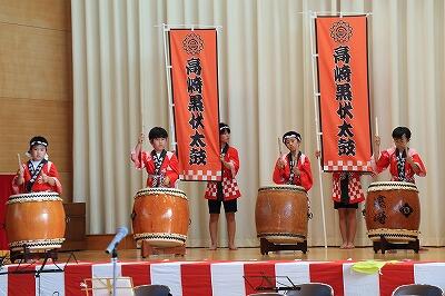 27日に本校体育館で行われた高崎地区夏祭りで,本校,4年生以上のみなさんが,地区の伝統,黒伏太鼓を披露しました。