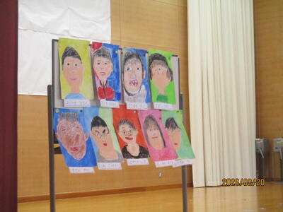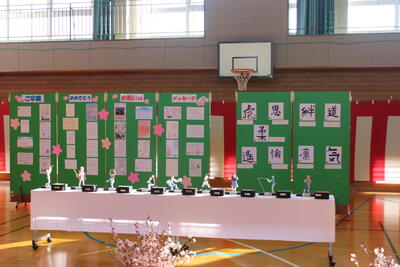 会場には、6年生の似顔絵や大切にしたい漢字一文字を書いた色紙が飾られました。