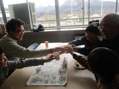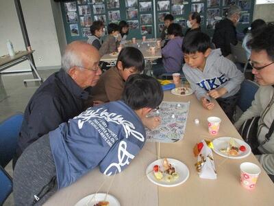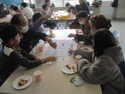 手作りのチョコバナナとフルーツ飴をいただきながら会食です。