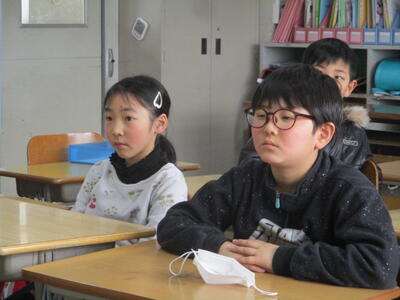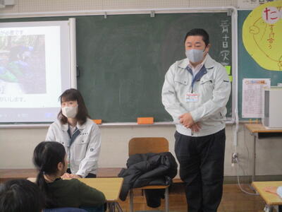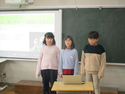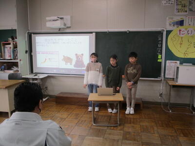 3・4学年の総合的な学習の時間で森林保全に向けてこれまで頑張ってきました。その中で,子供たちは,自分たちだけではできないことがたくさんあることを痛感しました。そこで,関山炭の売上金の一部を,みどりの募金として寄付し,その用途について,市役所の農林課の方に来ていただき提案しました。